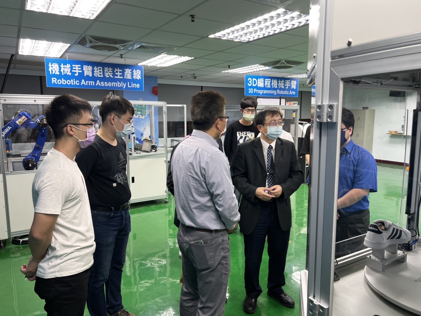 何校長在演講結束,並在古校長陪同下,前往參觀圖書館和屏商校區智慧機器人學系智慧機械手臂實驗性,與該系師生們現場對話交流討論,並提供寶貴意見。